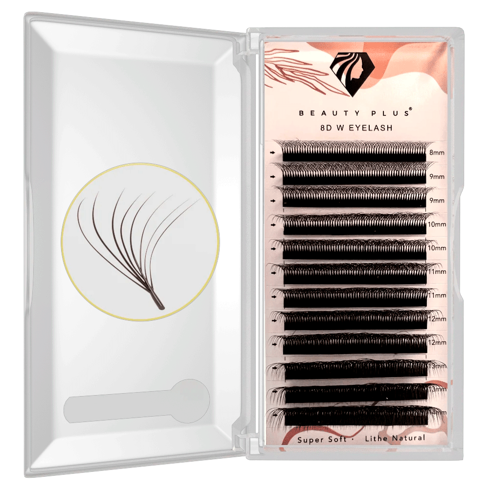 Las pestañas 8D-W de Beauty Plus están diseñadas para lograr un efecto de megavolumen con un acabado ligero y esponjoso. Su diseño en forma de «W» permite una mayor densidad sin comprometer la salud de la pestaña natural, facilitando además una aplicación rápida y eficiente.